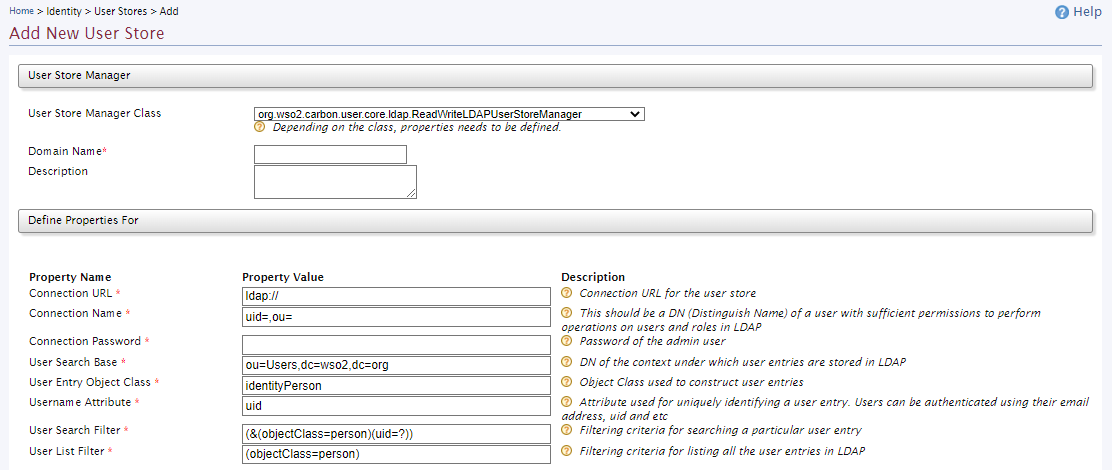 - Connection URL: ldaps://192.16.0.9:10389 (must import the certificate inside $APIM_HOME/repository/resources/security in case of ldaps)